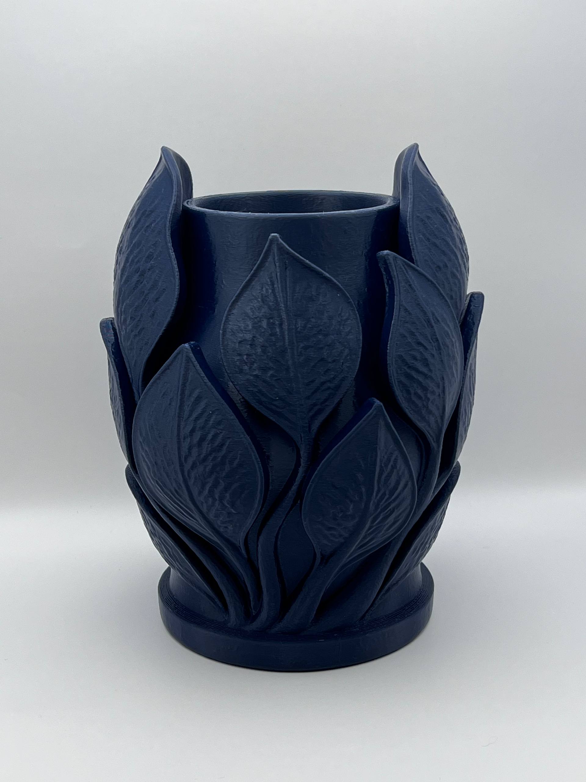 Ваза стоїть як маленький витвір природи, її гладка поверхня переливається теплим світлом, а по боках вирізьблене випукле листя наче оживає, обіймаючи тіло посудини. Кожна жилка листка виділяється тонкими гранями, створюючи гру тіні і світла.
