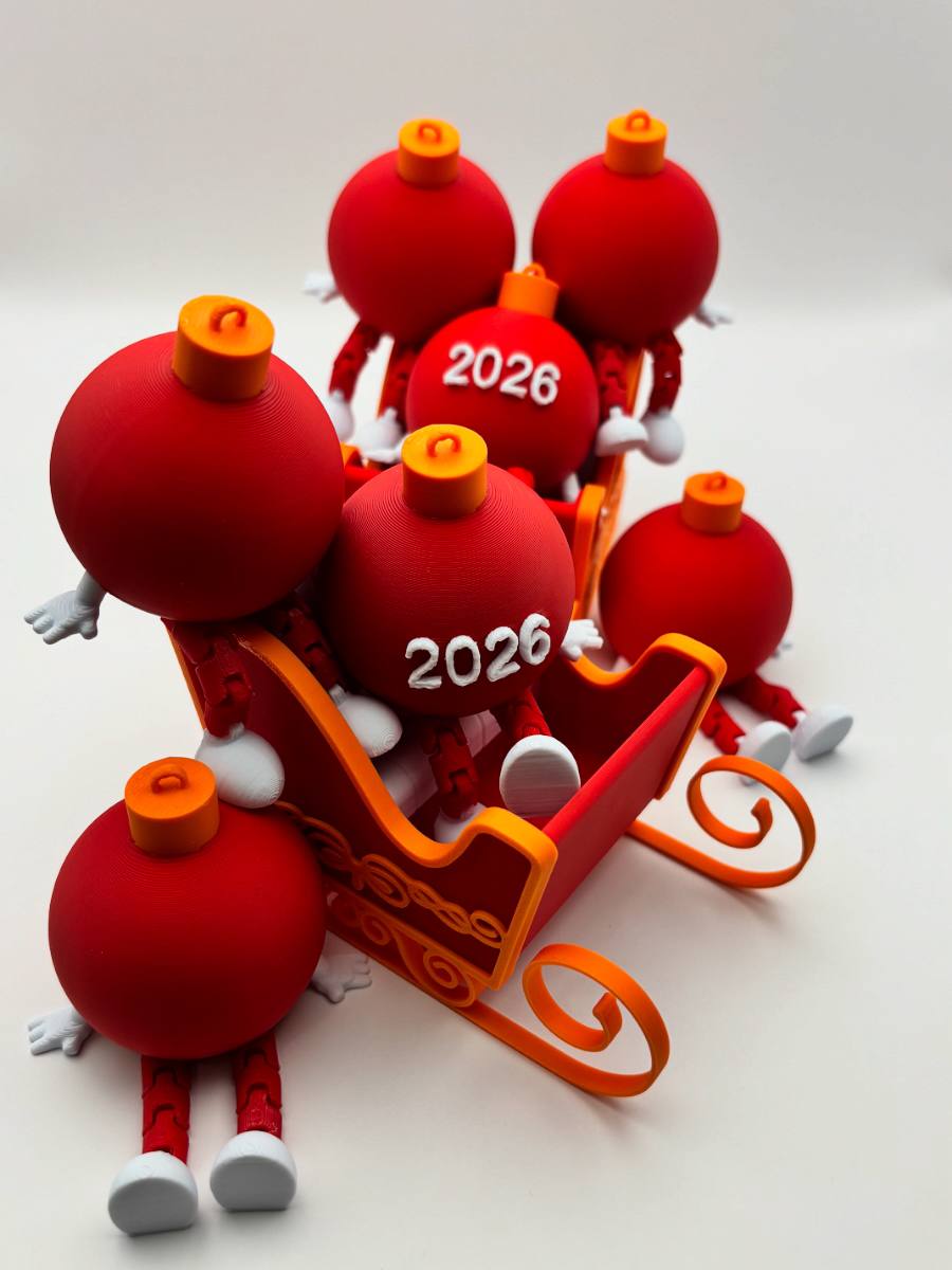 З боків у новорічної кулі — маленькі ручки, ніби створені для обіймів. Вони трохи вигнуті, дружні, завжди готові помахати або притиснутися до долоні. А знизу — рухомі ножки, легкі й пустотливі: здається, ще мить — і куля зробить крок уперед, потанцює або втече у веселу пригоду.