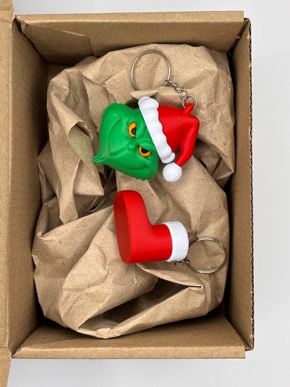 Бокс доповнюють два стильні брелоки: Грінч, з хитруватою посмішкою, здається, вже замислює щось кумедне; та чобіток, маленький символ подарунків і передчуття дива. Вони стануть яскравими акцентами на ключах, рюкзаку чи святковому пакунку.