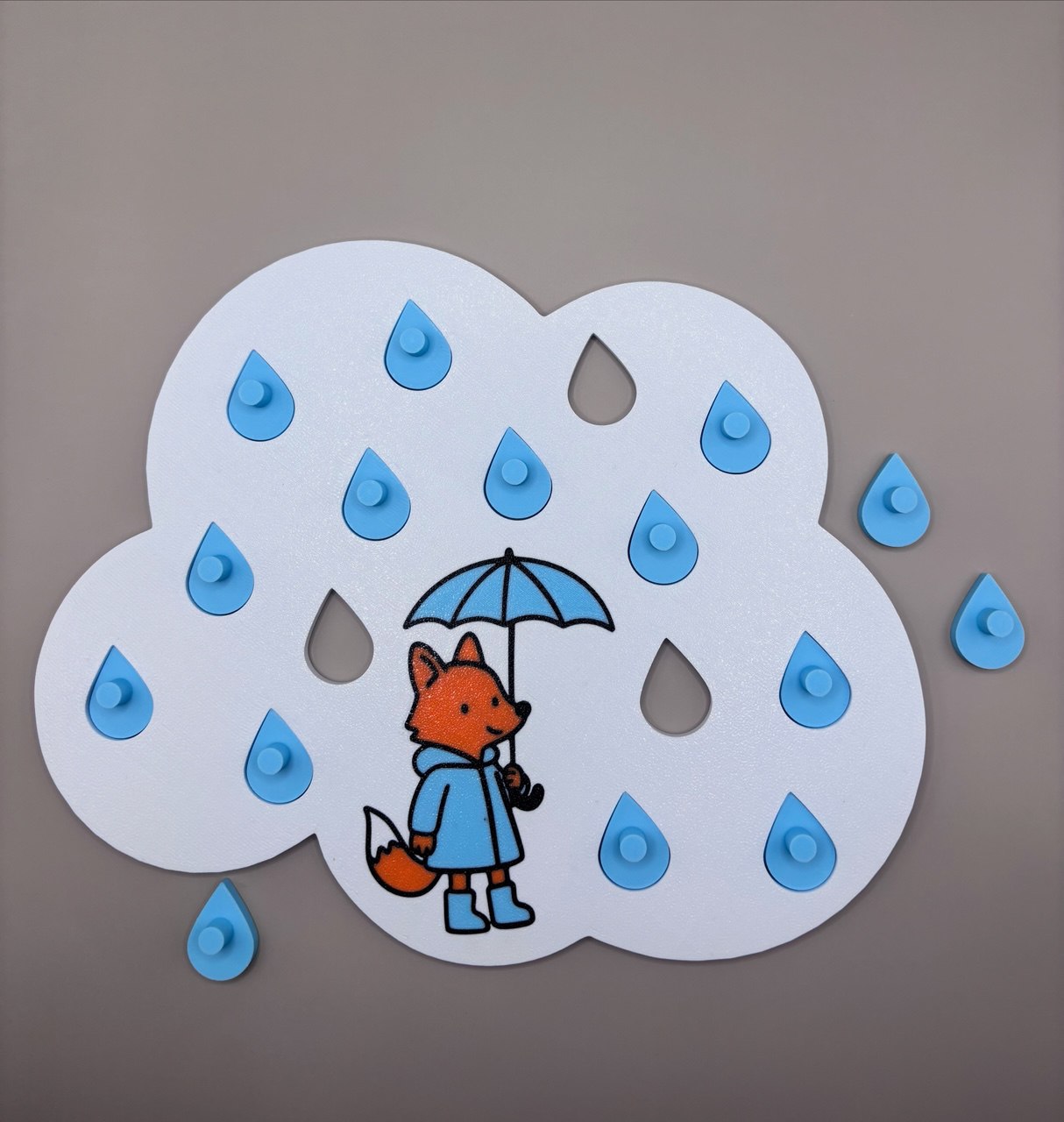 Під час гри можна обговорювати: “Скільки крапельок?”, “Якого вони кольору?”, “Що робить лисенятко?” — це розширює словниковий запас.